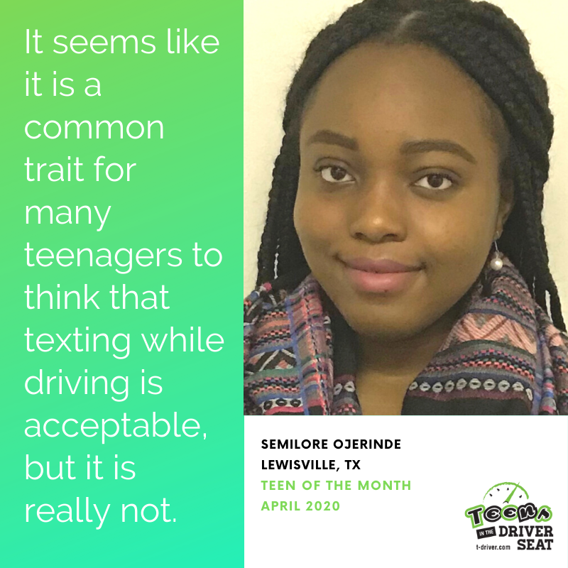 “ It seems like it is a common trait for many teenagers to think that texting while driving is acceptable, but it is really not. ” – Semilore